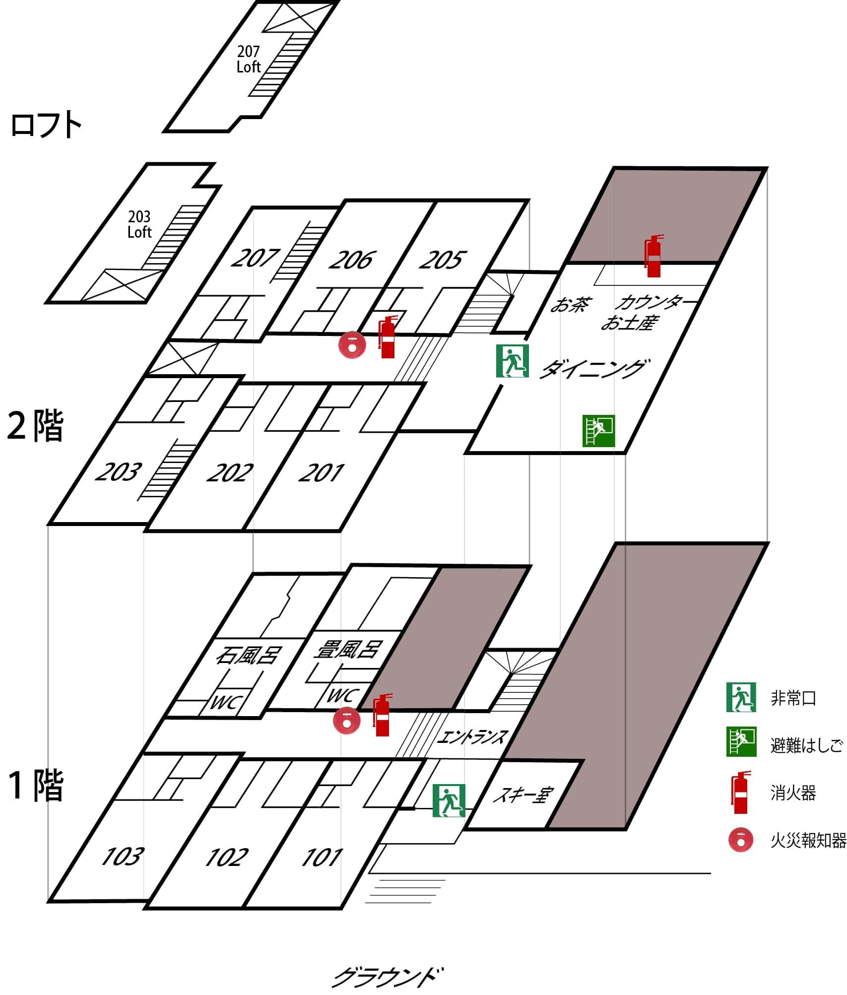 | 館内設備 | 本館:ダイニングルーム・ティーラウンジ、男女別浴場(石風呂・畳風呂)、脱衣場、客室、売店コーナー、飲物自動販売機、スキー用具置き場、貸スキー/貸スキーウェア/貸スノーボード、WiFi設備ありパソコン利用可、ファックス送信可、宅配便受付、グランドピアノ、研修機材(詳しくは「グランピング合宿」のページをご覧ください。)
